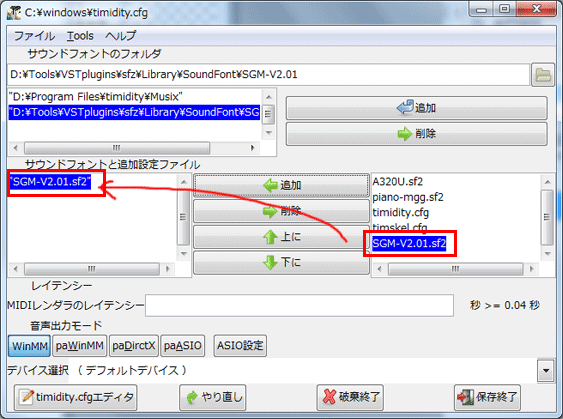 - もし不安なら timidity.cfg をバックアップしておくと良いと思うよ。