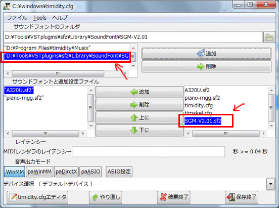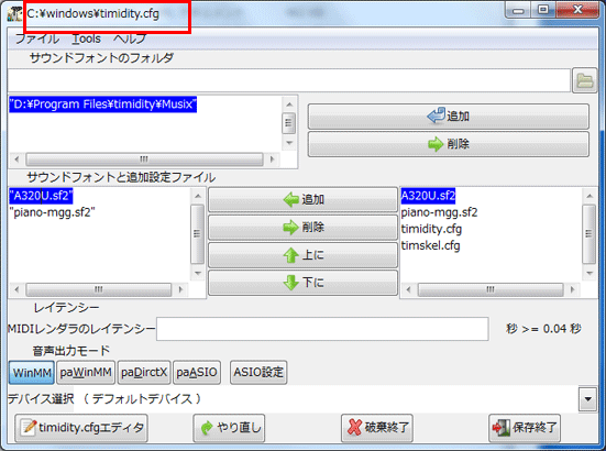 - もし不安なら timidity.cfg をバックアップしておくと良いと思うよ。